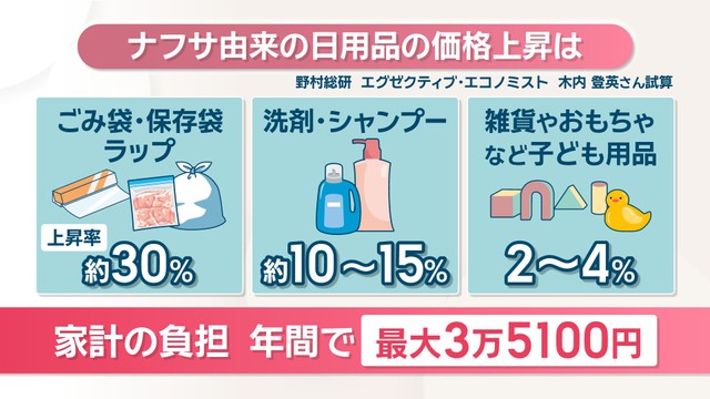 どれぐらい上がるのか、野村総研のエグゼクティブ・エコノミスト木内さんの試算では、ごみ袋や保存袋ラップは価格が3割ほどアップし、洗剤やシャンプーなどは約1~2割、雑貨やおもちゃなどの子供用品は最大4%アップすると試算しています。
