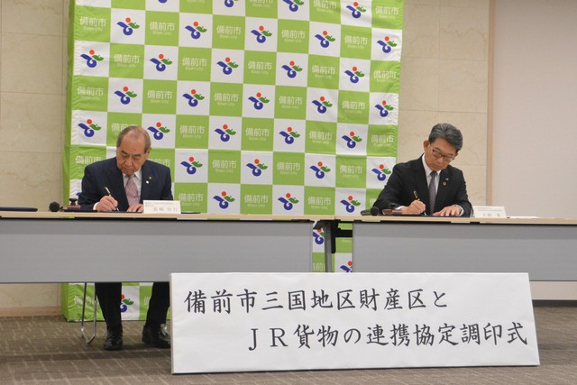 備前市役所で調印式が行われ、財産区の管理者の長﨑信行市長とJR貨物の犬飼新社長が協定書に署名しました。備前市によりますと、協定では、財産区が持つ備前市吉永町加賀美地区の0.35haの土地でJR貨物の社員らがイロハモミジ等の植栽、自然観察、環境教育等を行うということです。