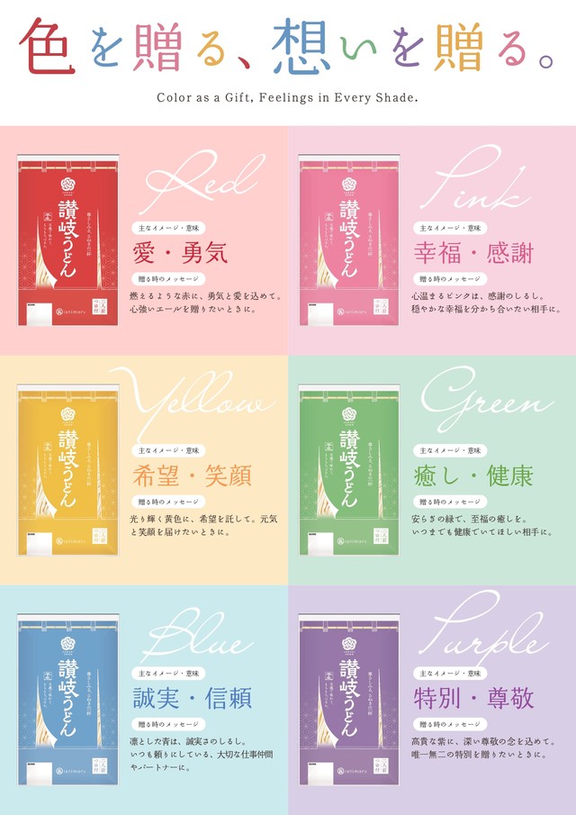 それぞれの色に「色言葉」を設定しています。赤色は「愛・勇気」、ピンク色は「幸福・感謝」、黄色は「希望・笑顔」、緑色は「癒し・健康」、青色は「誠実・信頼」、紫色は「特別・尊敬」で、自分へのご褒美や、大切な誰かに届けるメッセージです。うどんは、讃岐伝統の手打ち式製法で、コシの強いもっちりとした食感、麵つゆは、いりこだしを効かせた風味豊かな味わいです。