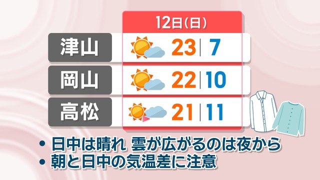 12日(日)も日中はお出掛け日和で、雲が広がるのは夜になりそうです。放射冷却の影響で朝は気温が10℃を下回るところもありますが、日中はこの時期らしい気温になるでしょう。寒暖差にご注意ください。
