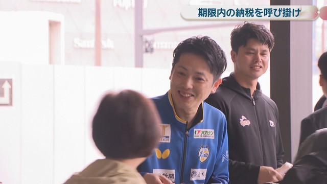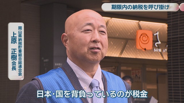 税金の円滑な納付を促す団体、「岡山県納税貯蓄組合 総連合会」とプロスポーツチームの選手らが10日、企業や個人事業主に対して消費税を期限内に納めるよう呼び掛けました。