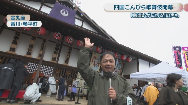 「さあ、こんぴら歌舞伎開幕です。空も明るくなってきました。お客さんが金丸座へと足を踏み入れます」