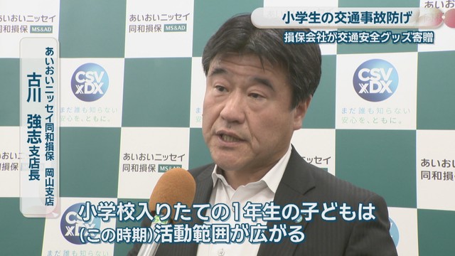 損害保険会社のあいおいニッセイ同和損保が13日、子どもの事故を防ごうと、岡山県交通安全協会に小学生向けのストラップ2000個を寄贈しました。