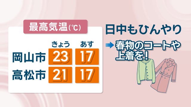 14日(火)は最高気温が23℃前後で少し動いていると汗ばむくらいの気温でしたが、15日は最高気温が大幅に低くなりそうです。
