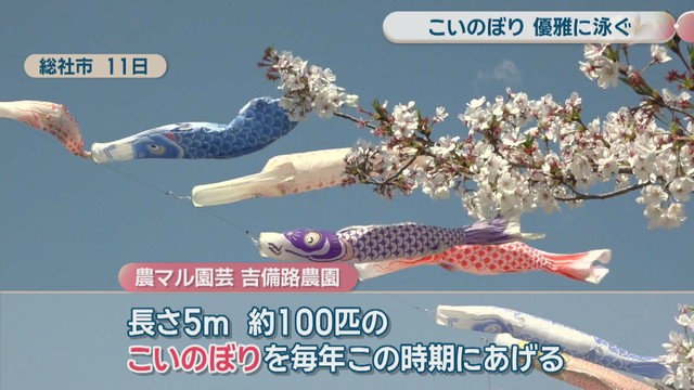 岡山県総社市の観光農園で約100匹のこいのぼりが優雅に泳いでいます。