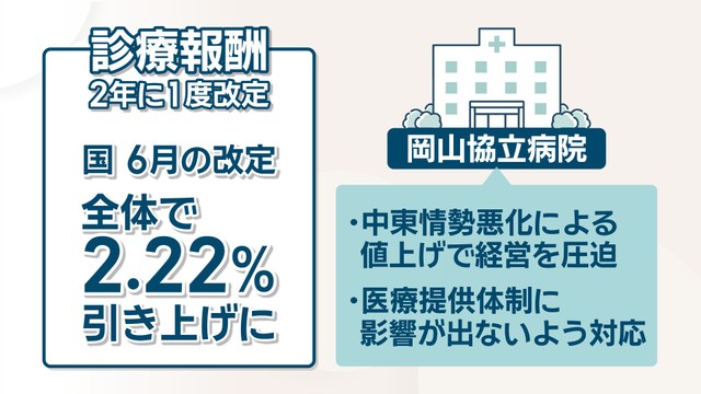 医療機関の収入面についてです。医療機関に支払われる「診療報酬」は2年に1度、国が改定しています。2026年6月の改定では全体で2.22%引き上げとなりますが、岡山協立病院では中東情勢悪化の影響による値上げもあり、経営を圧迫する医療提供体制に影響が出ないよう対応する必要があるとしています。