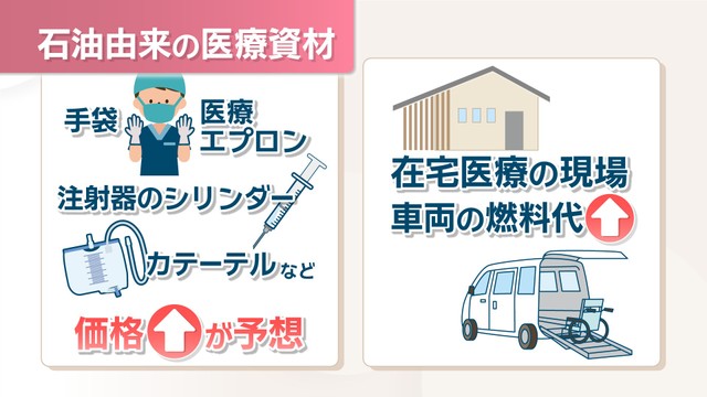 石油由来の医療資材には、医療エプロンや手袋、注射器やカテーテルなどがあり、こうした資材の価格は今後上がるのではないかと見られています。また、原油高により、在宅医療の現場では車の燃料代がかさむことが予想されます。