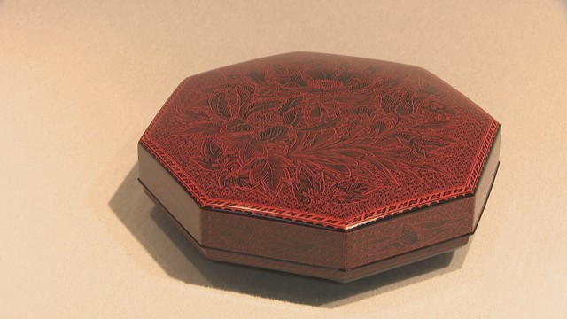 「彫漆」という技法で作られた作品は、色を何重も重ね、彫る深さによって色の違いを出すのが特徴です。約100回、漆を塗り重ねています。