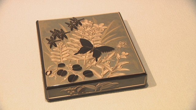 彫った溝に色を入れて磨き、つるつるした表面に仕上げる「蒟醤」という技法と、色を重ねることで立体感を出す「存清」という技法を用いた作品を見ることができます。