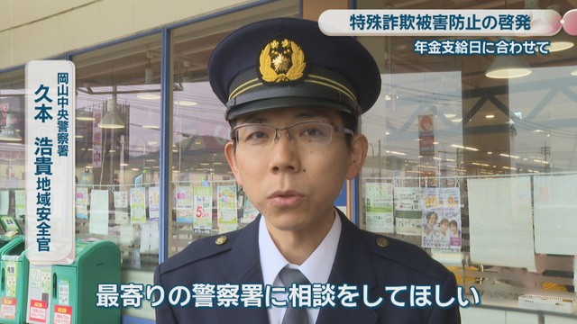 特殊詐欺で狙われやすい高齢者などに被害防止を呼び掛けようと、岡山県警が年金の支給日に合わせて行いました。