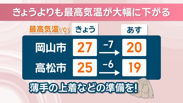 また28日(火)より最高気温が大幅に下がるところが多そうです。岡山市では7℃、高松市では6℃下がりそうです。