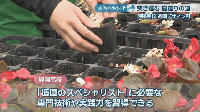 「造園のスペシャリスト」に必要な専門技術や実践力を習得することができる興陽高校。1、2年生の間は造園・草花に関する基礎的な内容を幅広く学習し、3年生からは専門的な実習などを通して知識と技術を身につけます。