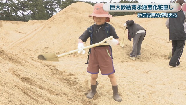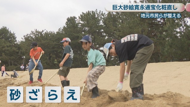 29日は、子どもから大人まで地元のボランティア400人が普段は入ることのできない砂絵の近くに入って、スコップで形を整えていました。