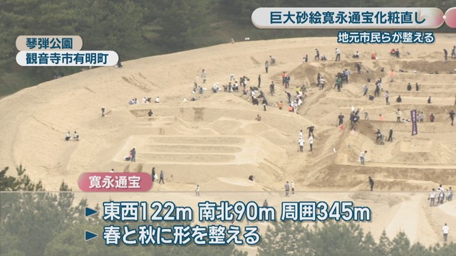 香川県観音寺市のシンボル、寛永通宝の砂絵。地域のボランティアらが年に2回行っている「砂ざらえ」という作業で形を整えました。