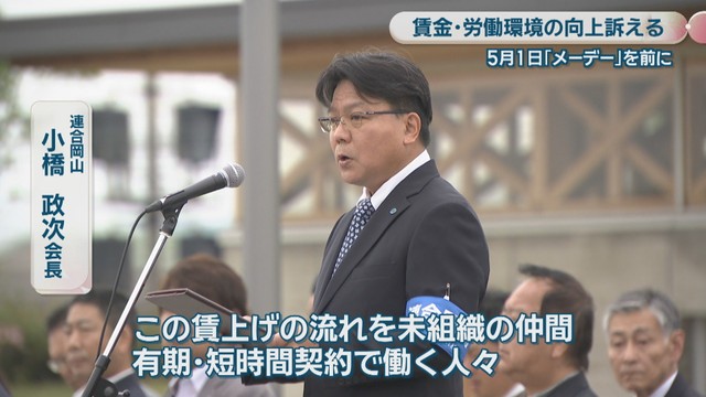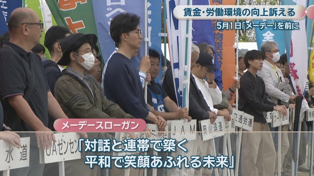 民間企業や公務員などの労働組合が加盟する連合岡山が、5月1日の「メーデー」を前に4月29日、岡山県中央メーデーを開き、賃金や労働環境の向上などを訴えました。